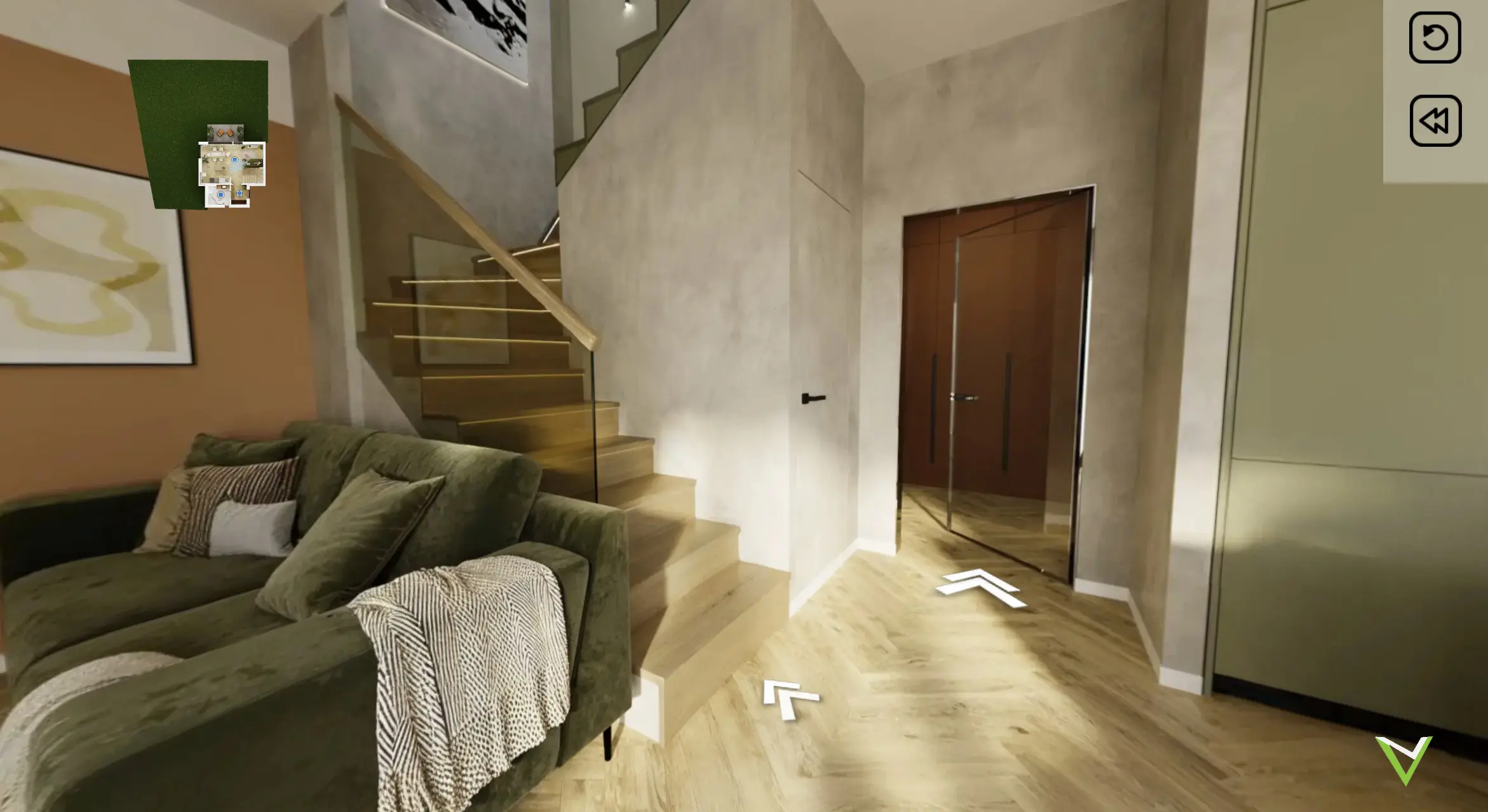 Kolejnym etapem jest renderowanie wysokorozdzielczych panoram 360° lub wykorzystanie technologii Gaussian Splattingu, aby nadać scenie wyjątkową głębię i autentyczność. Na tym poziomie mamy pełną swobodę aranżacyjną – możemy wirtualnie wyposażyć puste wnętrze (virtual staging) lub zmienić kolorystykę ścian zgodnie z życzeniem klienta. Gotowe panoramy są następnie łączone w intuicyjny, interaktywny system nawigacji.